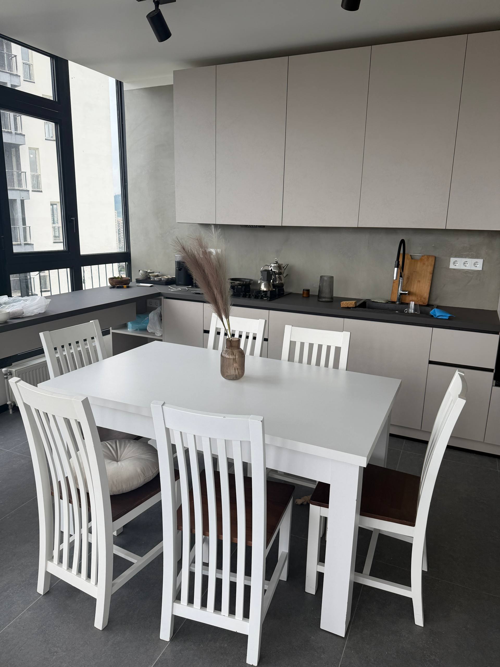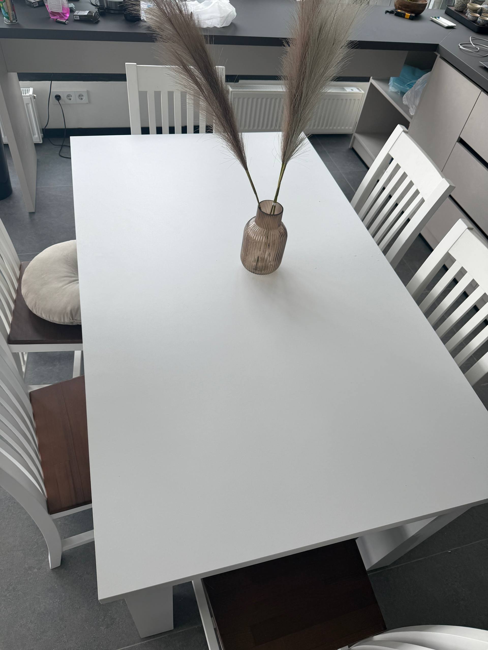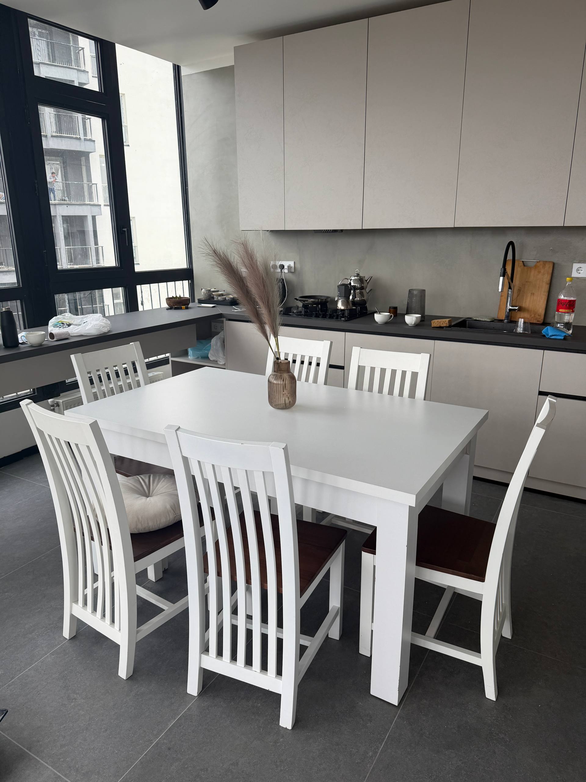 Стол 150x90 см, раскладывается до 205x90 см. В комплекте 6 стульев. Есть следы эксплуатации, сколы и царапины. Цена за всё: 650 лари.