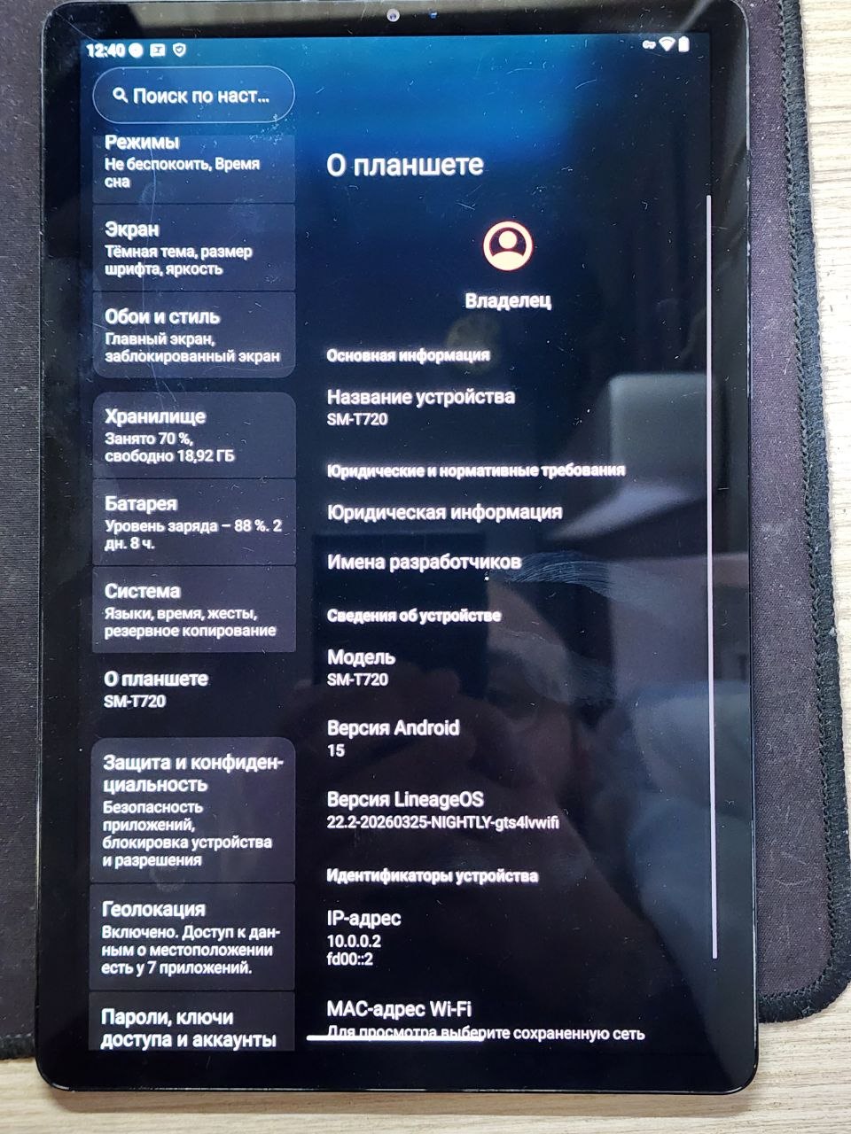 Планшет Samsung S5E 4/64GB Wi-Fi. Имеет косметические дефекты, на работоспособность не влияют. Заряд держит хорошо, установлен кастомный Android 15 (Lineage OS), работает без лагов. Качественный AMOLED экран и динамики AKG.